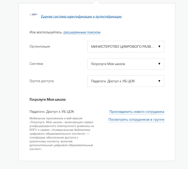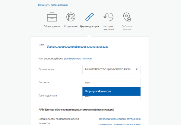 Госуслуги ® Администратор ® Профиль организации ® Доверенности и Доступы ® Группы доступа ® Расширенный поиск ® Присоединить нового сотрудника